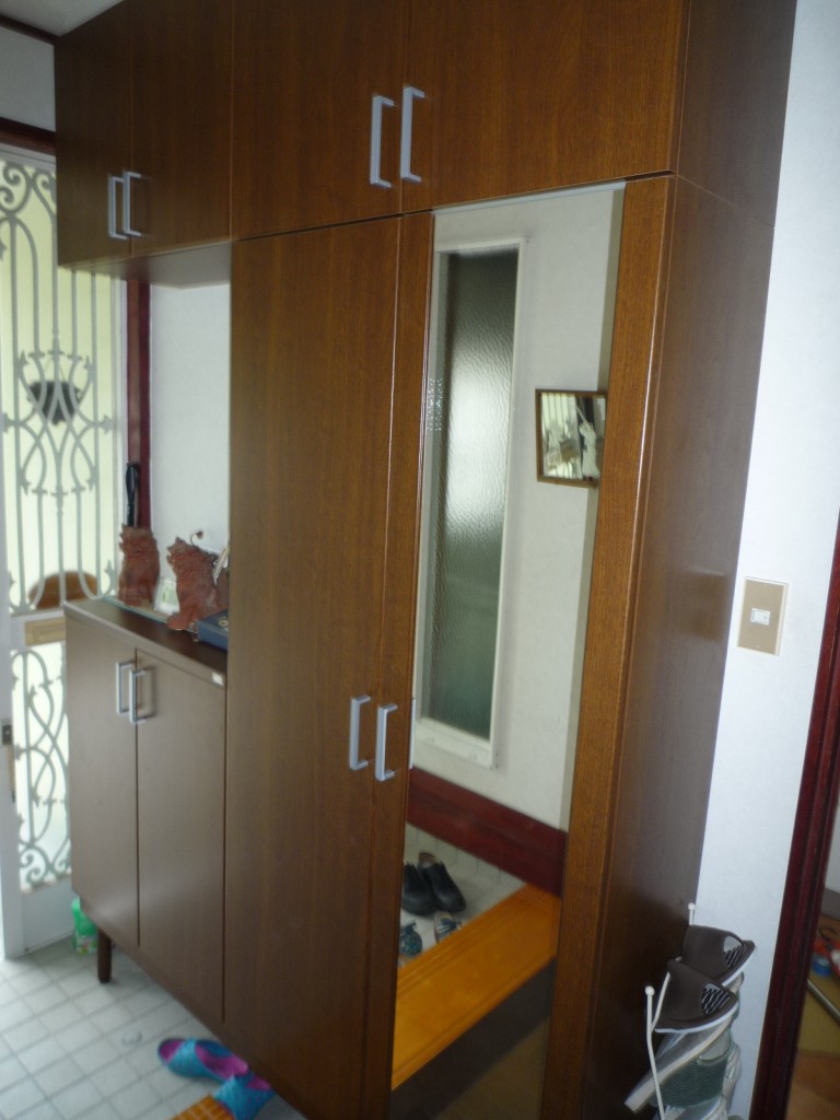 古い下駄箱を撤去して新しい玄関収納を取付けます。取り外したものと大きさが違うので壁クロスやフローリング材の補修作業を行います。