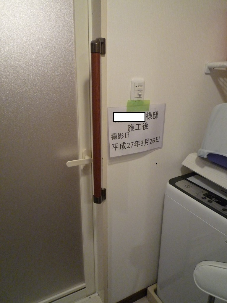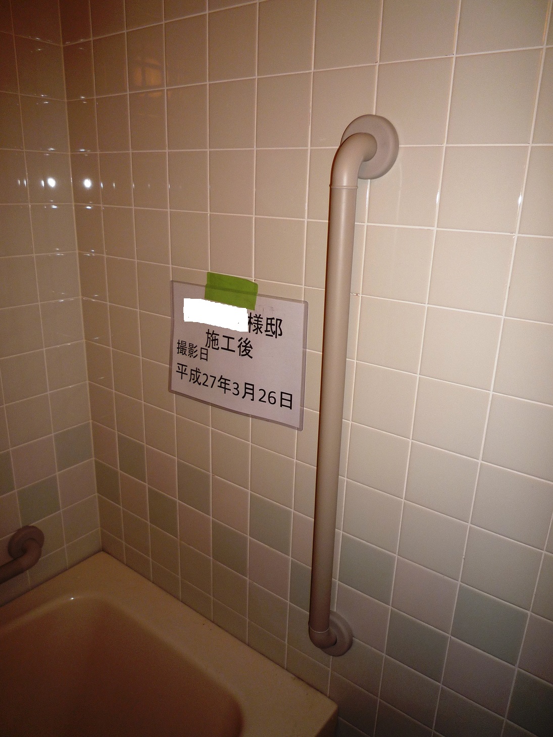 手すりを取り付ける前にお客様に位置と高さを現物を当てて確認します。設置個所の下地を調査し、間柱等がない個所には後付け補強板を取付けます。手すりを取付けます。