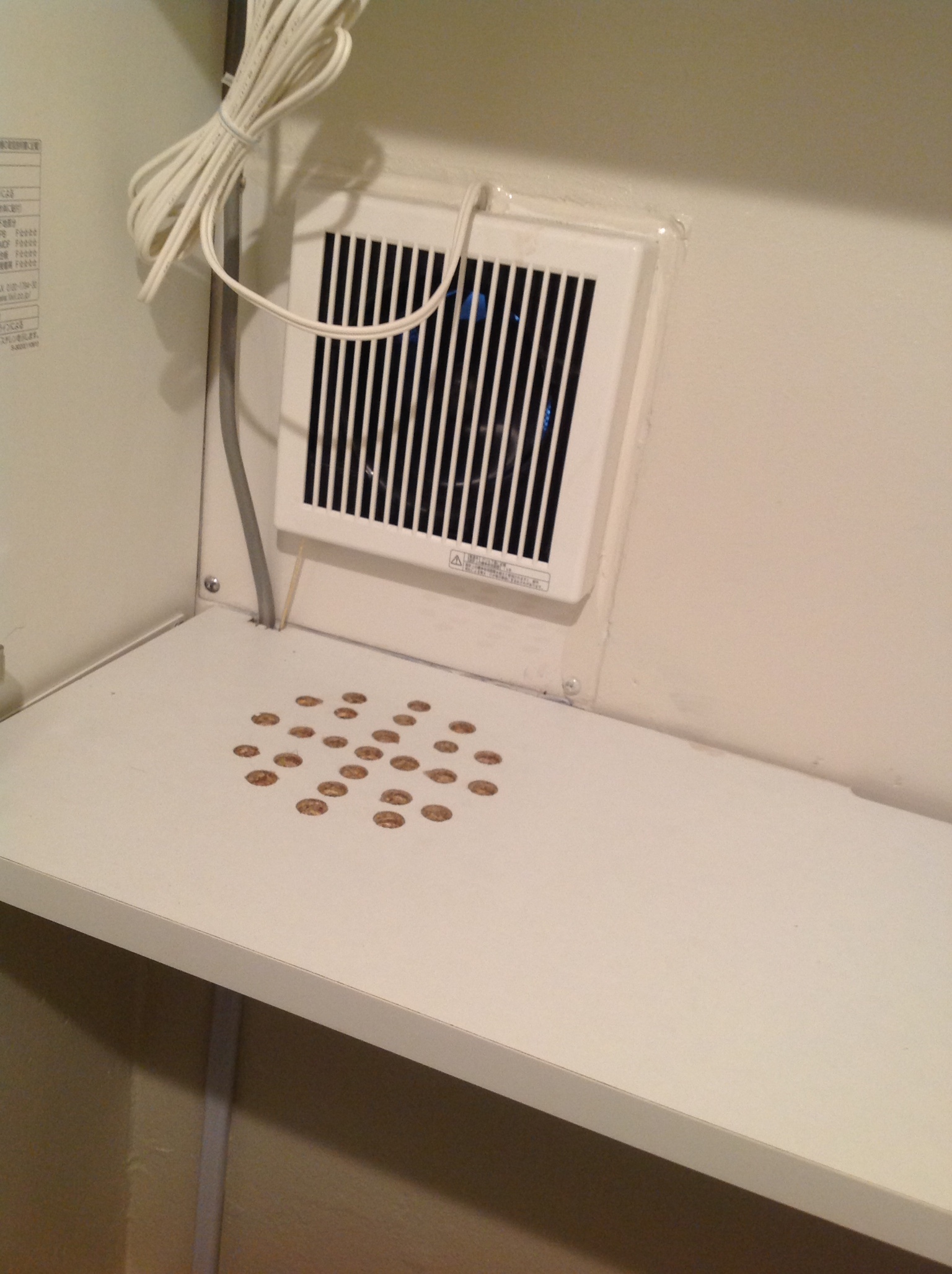 便器のタンクの上には収納棚があります。その中に換気扇を付けました。